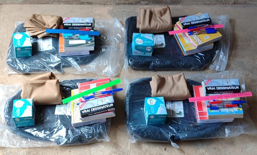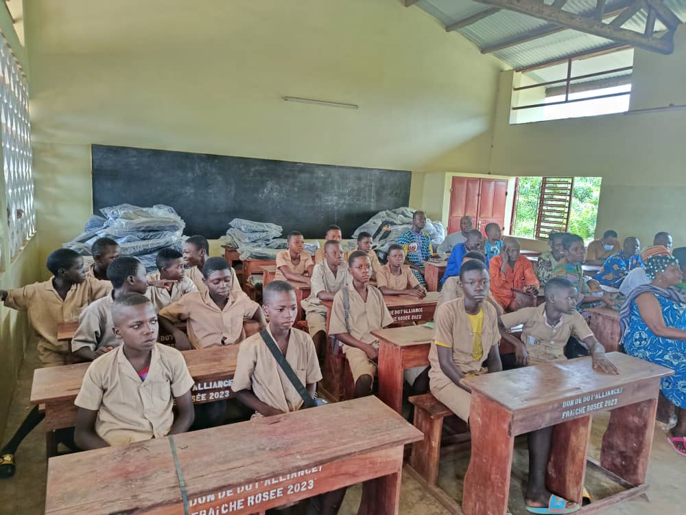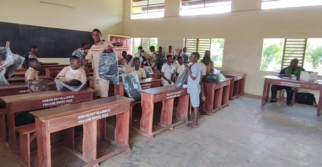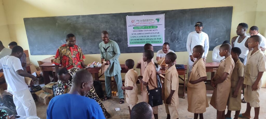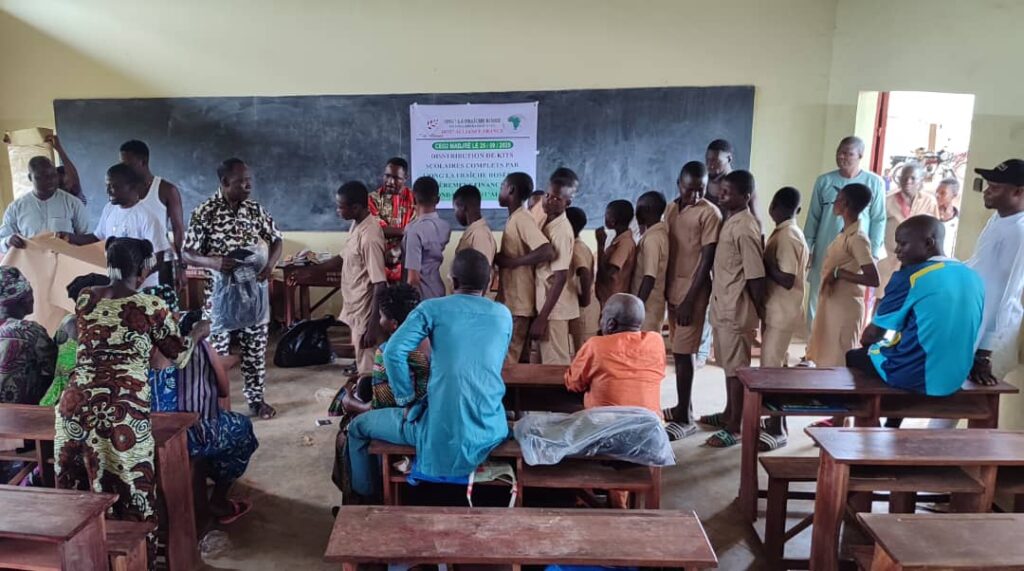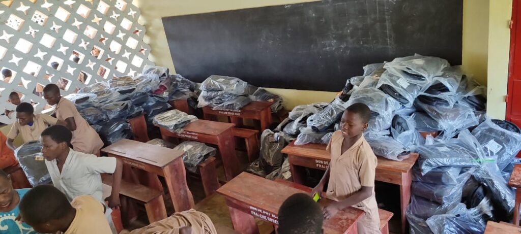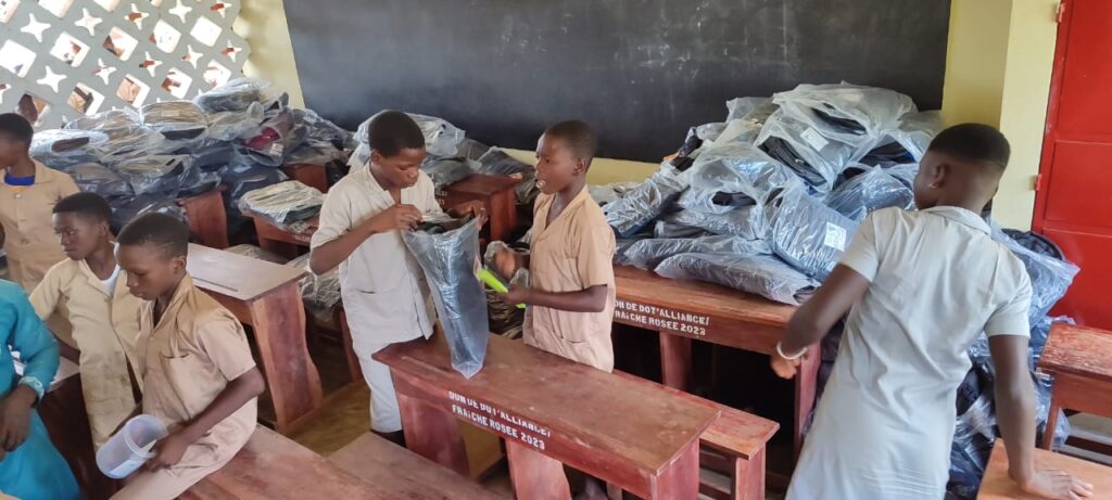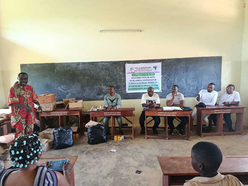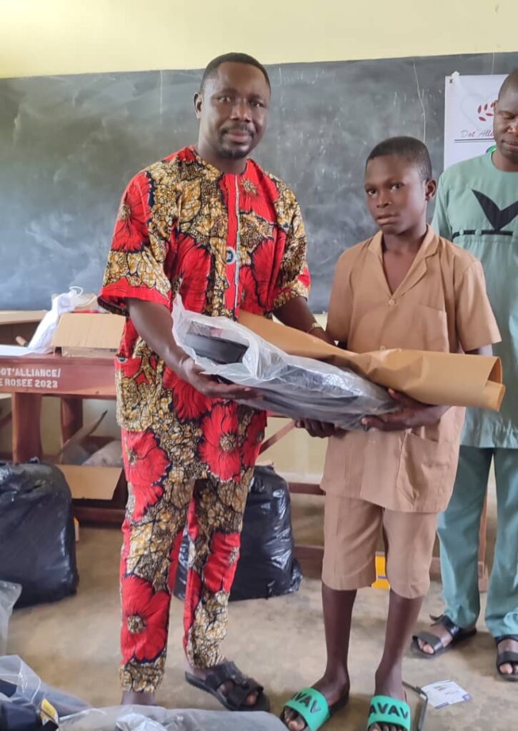Distribution des fournitures scolaires aux familles en difficulté sur le Groupe Scolaire de Madjrè au Bénin dont Dot alliance a financé grâce à vous la construction.
